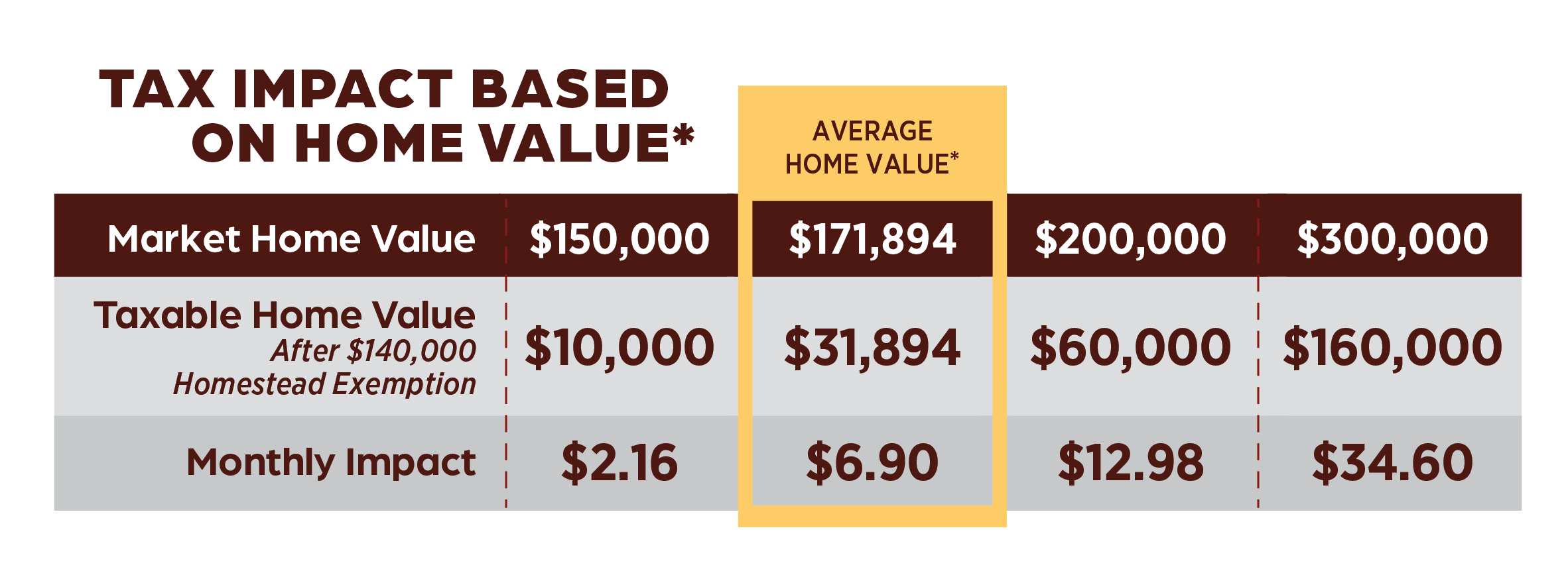 *ALL TAX IMPACT PROJECTIONS INCLUDE A $140,000 HOMESTEAD EXEMPTION PROPOSED FOR NOVEMBER 4, 2025. IF APPROVED, ALL TEXAS HOMEOWNERS WOULD BE ELIGIBLE FOR A $140,000 STATE HOMESTEAD EXEMPTION ON SCHOOL TAXES—AN INCREASE OF $40,000 FROM THE CURRENT EXEMPTION.